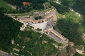 エーレンブライト要塞は、10世紀末に貴族のエーレンベルトによって最初の城が建てられ、エーレンベルトシュタイン城と名付けられた後に、エーレンブライトシュタイン城となりました。12世紀になるとローマ帝国のトリーアの大司教の所有に帰する城となります。17世紀から18世紀に入ると要塞として増強され、容貌も要塞らしく姿を変えるものの、フランス軍により落城。しかし1817から1828年にはプロイセンがこの要塞を再構築し、ヨーロッパでも屈指の石のごとき固い護衛を誇る最強で巨大な現在観られる要塞となりました。この要塞の歴史や建築技術はこの城にある興味深い博物館の資料で閲覧出来ます。レストランのテラスからはコブレンツの町、ライン川、モーゼル川、ヴェスターヴァルトの森などが作り出す素晴らしい景色が望め、その景観は心に深く刻まれる事でしょう。